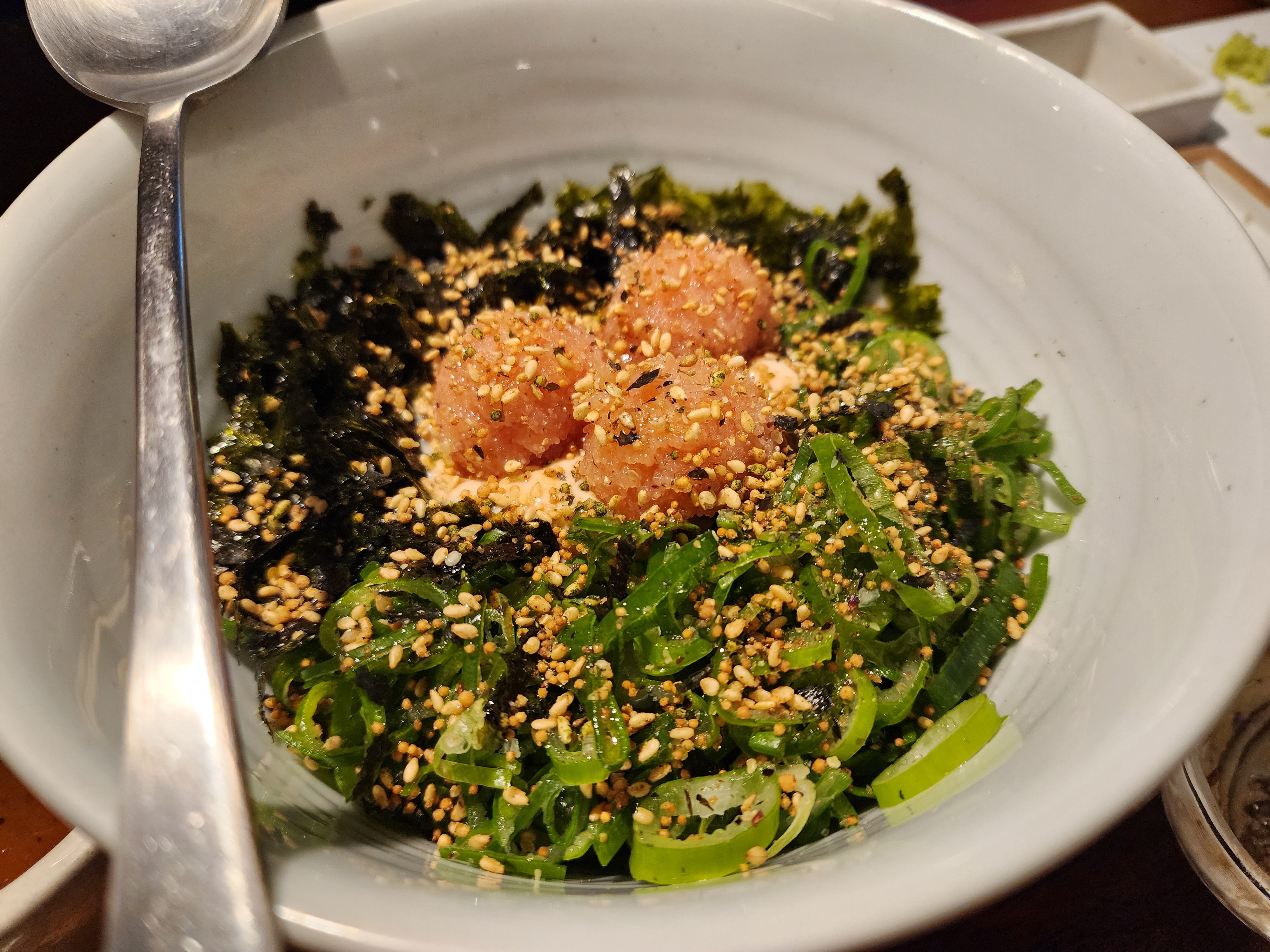 명란고추덮밥의 맛: 약간 비릿할 수 있는 명란에 고소한 참기름이 상큼한 고추와 잘 어울려서 약간 심심한 듯했지만 그래도 술술 들어가는 덮밥이었다. 고기를 추가해서 먹고 먹은 거라 배가 부른 상태였는데도, 전혀 자극적이지 않고 부드럽고 고소하게 목 넘김이 굉장히 좋았다.